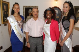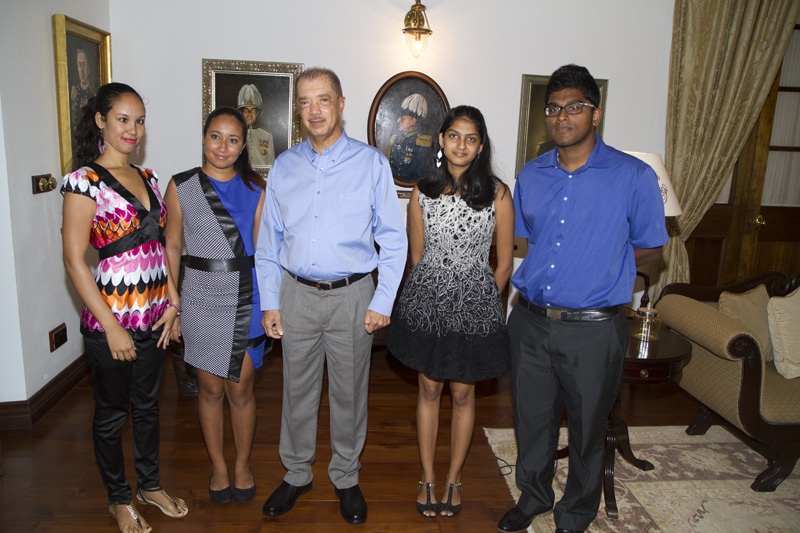 12 August 2014 | President James Michel in a souvenir photo with Mr. Karen Bedier, Ms. Ushna Dhanjee, Meenakshi Rajasundaram and Salina Sinon at State House. All 4 students gained straight A's in their examinations and won the Academic Excellence Award at the School of Ad