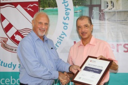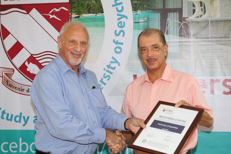 10 July 2015 | President James Michel, who is also the Chancellor of the University of Seychelles, receiving with a copy of the Certificate of Recognition of the University of Seychelles as a Registered Centre of the University of London, at a ceremony at the Anse Royal